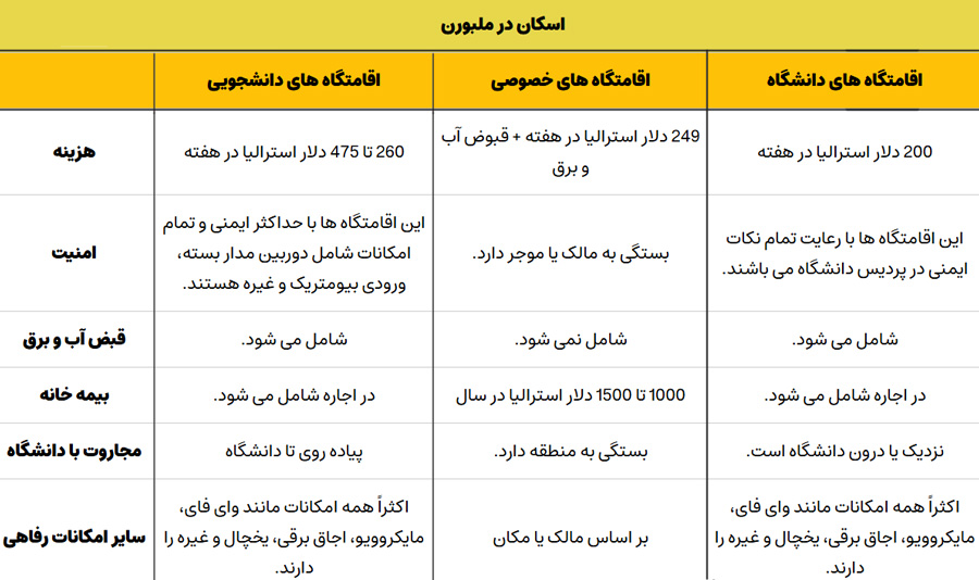قیمت خوابگاه های دانشجویی در ملبورن بسته به عواملی مانند موقعیت مکانی، امکانات رفاهی و نوع مسکن می تواند متفاوت باشد. اقامتگاه های دانشجویی هدفمند بسته به نوع ملک می تواند از حدود 260 تا 475 دلار استرالیا در هفته متغیر باشد.