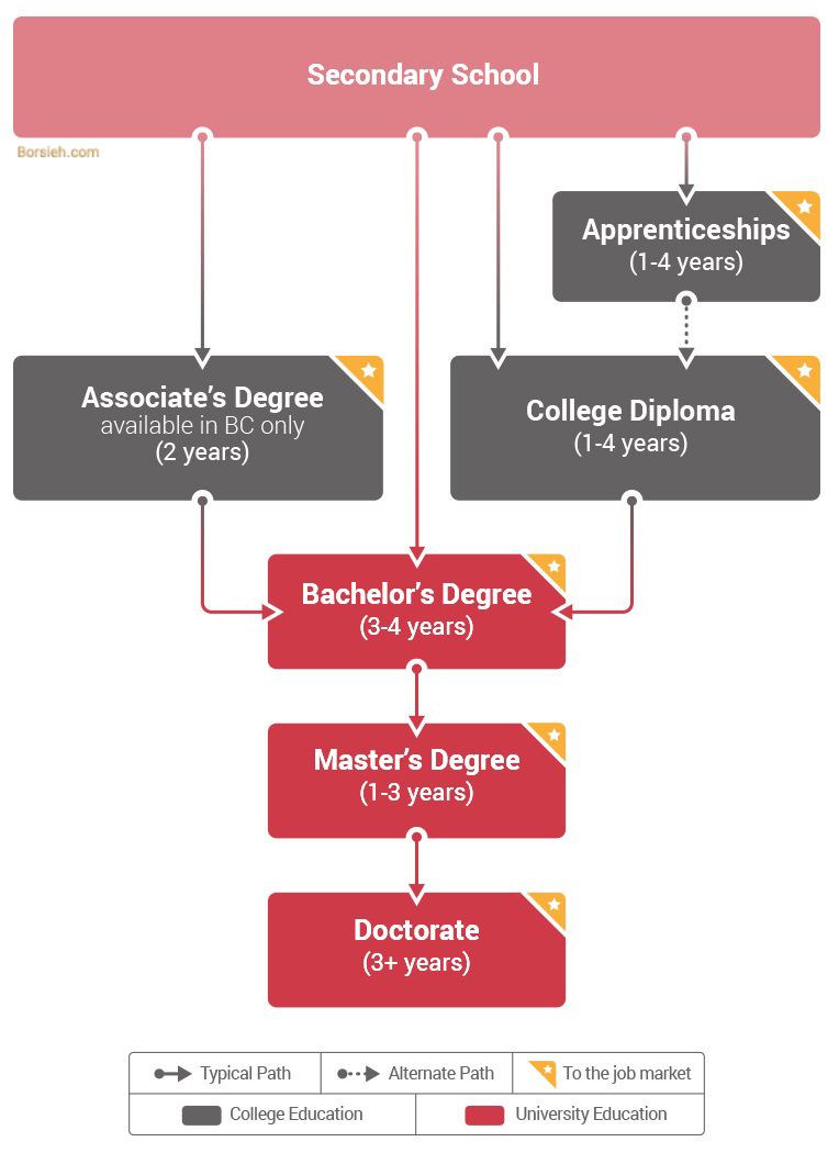 - دانشگاهها (Universities): تحصیل در کانادا در دانشگاهها به دلیل رهبری در زمینه پژوهش و ارائه دورههای متنوع در رشتههای مختلف، از جمله مهندسی، علوم انسانی، کسب و کار و فناوری اطلاعات، بسیار محبوب است. دانشگاههای کانادا از دیدگاه بینالمللی نیز مورد تقدیر قرار گرفتهاند و پس از فارغالتحصیلی مدرک کارشناسی، کارشناسی ارشد یا دکتری در اختیار دانشجویان قرار میگیرد.